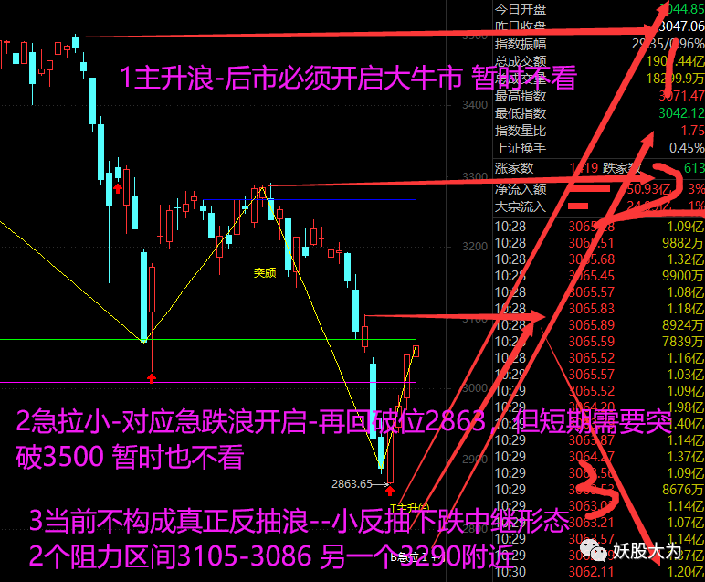 微信关注公众号,搜索“妖股大为”;希望有缘的你一起探讨与交流:炒股如做人,股性如人性,股品如人品! 免责声明:本文及本公众号为个人交易思路的记录和分享,所有观点仅代表个人立场,不构成任何投资建议!读者据此进行投资,须风险自担,责任自负! 2022.5.5“瞄准3086.92做策略”-上证防守点3042; 1.按照“假期预期”的观点:上证突破3050则代表短期2863的日线反抽能持续4-6天概率大,反抽“补缺”之后的强阻力已经提高到了3105.66--3086.92区间;3105.66突破才能“向上继续扩展时空”(下个3160.90--3207.83),暂时先看3086.92--3105.66; 2.从时间与k形态看,周四“冲高回落”收阴形态更好,周五可以在不继续破位2969的前提下下影线k继续走好,这样下周上证就不容易破坏周线k形态; 但假若周四“霸王硬上弓,不冲高回落”,则周五是“超短必出”!毕竟本周是3290小高点后“第四周”,也是“最短的周线江恩正方形时间”,周五也是日线2863后第四天,根据“4循环节奏”,很很容易有”超短60分高点“,超短需要防范“日线小高点概率”;当下上证超短防守点提高到3042点位; 毕竟60分“强力反抽”至今,60分趋势到了“超高位”,60分获利盘多多,60分趋势调整对个股打击就大; 3.当下对上证来说,短期最安全的走势需要上证突破3086.92;只要3086.92突破周五明天还要特别注意“上证3047.06收盘是否站稳”; 一旦周五3047.06收盘失守--则代表周线反抽还没开启;一旦周五站稳了3047.06,则下周上证就没理由回撤,因为只要破位本周最低点则上证周线就很容易走坏;