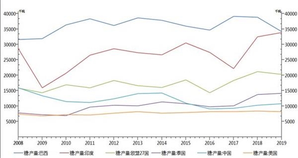 2018年国内糖价震荡下行,2019年预计食糖将小幅增产,而国际市场在2018/19年度的过剩幅度可能大大低于此前预期,全球糖价有望在2019年出现重要底部,为熊市向牛市的转变打好基础。所以,整体上2019年全球糖价表现很有可能要强于2018年。国内市场也是如此,新糖增产幅度只要不超过预期,且甘蔗价格维持高位,在外糖回升的配合下,国内糖价的波动重心也将抬高。国内产量增幅以及未来印度食糖的生产和出口形势分别是影响国内及国际市场的主要因素。预计2019年郑糖主力合约大部分时间可能会在4600~5800元区间波动。 第一部分白糖期货2018年行情回顾  图1-1。 2018年白糖指数走势图 资料来源:文华财经方正中期研究院整理 (一)第一阶段(2018年1~7月中旬):糖价震荡下跌 进入2018年以后,国内糖价整体下行,特别是期货价格走势更弱。国内食糖连续第二年增产,而销售形势不乐观,截至5月末糖厂工业库存达到456万吨,较上年高出55万余吨,是2015年以来同期最高水平。此外,国际市场面临严重过剩,印度、泰国食糖产量创出新纪录,巴西减产的影响被抵消,国际糖价也创下2015年10月份以来的新低。 (二)第二阶段(2018年7月中旬以后):糖价震荡做底 2018年国内糖价在7月中旬出现阶段性底部。7月食糖销量意外出现大幅增加,并且8、9月份销量也连续好于上年同期。虽然国际市场ICE原糖在8月下旬一度跌破10美分。不过,随着巴西政局逐渐稳定,雷亚尔走强令糖厂售糖积极性减弱,加上巴西食糖减产严重,国际糖价在10月初开始持续回升。国内糖价在国庆假期之后跟随外盘走高,特别是印度发生严重虫害可能导致食糖产量大减的消息带来显著利多影响,加上甘蔗收购价格可能维持500元附近的消息支持,郑糖远期合约率先突破底部震荡区走出反弹行情。不过,国际市场继续过剩的压力犹存,巴西雷亚尔在国内大选结束后转弱,国际糖价也逐渐回落。国内甜菜糖厂在9月中旬开榨,内蒙古食糖预估增产30%以上,而下游消费进入淡季,糖价也再次回落。 第二部分全球食糖供应过剩但幅度逐渐减小 一、主要产糖国生产形势将分化印度产销成为主要影响因素 2017/18年度全球食糖增产势头依旧,印度、泰国、欧盟增幅较大。其中印度食糖产量达到3240万吨,泰国产量达到1370万吨,欧盟为2100万吨,均为历史高位。 市场普遍预计2018/19年度全球食糖将继续供应过剩,但对过剩幅度存在分歧。先是预期印度食糖将大幅增产是造成全球过剩加剧的重要原因之一,预计2018/19年度其产量为3380~3550万吨,而10月份又传出印度第二、第三大产区出现严重虫害,可能导致食糖减产300万吨的消息。但是,印度食糖库存预计仍将达到1000万吨,未来出口压力是潜在的重要利空因素。而最大产糖国巴西遭遇长期干旱导致产量减少,且大量甘蔗用于生产乙醇。2018/19年度巴西的中南部主产区预计产出甘蔗5.665亿吨,其中38.35%将用来榨糖。糖产量预计为2850万吨。此外,欧盟食糖减产的可能性大,不利天气及糖价低迷是主要原因。泰国食糖可能小幅减产,但仍处历史高位。 囯际糖业组织(ISO )在11月初预计, 2018/19年度(10月-次年9月)全球糖市料供应过剩217万吨,较8月份预测值下调了458万吨。ISO也缩减了2017/18年度糖市供应过剩预估至728万吨,而上次预估为860万吨,更早时预估为1051万吨。 所以,2018/19年度全球食糖供应压力依然存在,但较2017/18年度或许减轻。印度糖出口形势可能成为影响世界糖价的主要因素,当然巴西食糖的产销情况也很重要。  图2-1。 全球主要产糖国(地区)产量形势 资料来源:美国农业部(USDA) 方正中期研究院整理 二、国内食糖增产周期尚未结束 1、2018/19年度食糖将继续增产 | 2017/18年度(万吨) | 2018/19年度(万吨)预测 | | 国内产量 | 1031 | 1060 | | 进口量 | 243 | 240 | | 政策抛储 | -- | 30 | | 消费量 | 1520 | 1500 | | 供应-消费 | -246 | -170 |