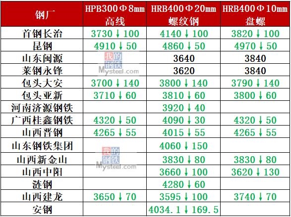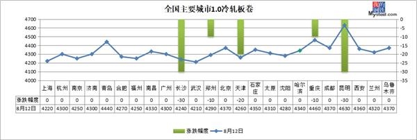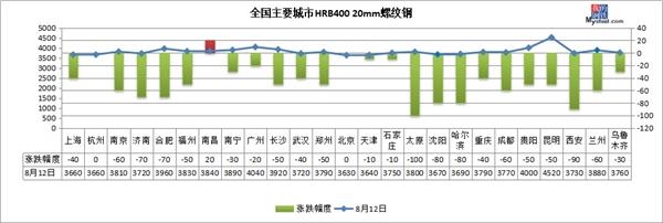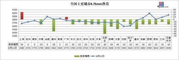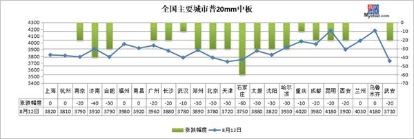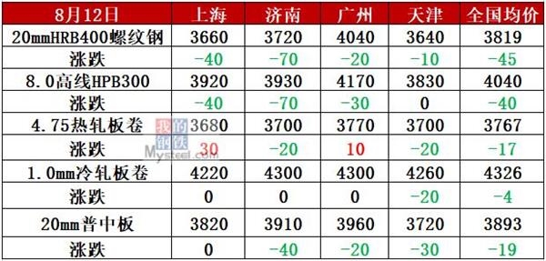 8月12日,国内钢材市场普遍走弱,唐山普方坯出厂上涨10报3470。周末唐山钢坯下跌40,今日上午钢材现货市场跟随下跌,不过午后钢材期货快速拉涨,可能受山西、四川等部分钢厂传出减产计划影响,空头获利平仓较多。明日部分市场钢价或有探涨,在钢厂落实减产前,后期仍存在变数。  12日,期螺主力午后拉涨,收盘价3677涨1.63%,重回MA5上方,DIF与DEA双交向下,RSI指标三线位于35-40,处于布林带下轨运行。一方面7月下旬以来期螺累跌400左右,空头盈利可观,部分获利套现。另一方面,最近钢厂减产消息较多,空头也有规避风险的需求。  12日,国内12家建筑钢材生产企业下调出厂价30-140元/吨。  钢材现货市场 建筑钢材:8月12日,全国25个主要城市20mm三级螺纹钢均价3819元/吨,较上一交易日下跌45元/吨。午后随着期货价格反弹,部分市场报价出现小幅回升,午后出货量较上午相比明显好转,个别市场投机情绪开始活跃。钢厂方面,受利润压缩影响,近期福建、东北、山西个别钢厂开始出台限产检修计划,预计本周产量将继续缩减,市场供应压力将进一步缓解。总体来看,上周价格大幅回落之后,市场存在部分抄底的现象,预计明日现货价格将逐渐企稳,个别市场存在反弹的可能。  热轧板卷:8月12日,全国24个主要城市4.75mm热卷均价3767元/吨,较上一交易日下跌17元/吨。目前华东市场为价格洼地,市场大多是投机需求低价收货;而华北地区价格偏高,北方资源要么就地消化或南下华南。就后期来看,钢厂产量暂没有明显减量的计划,短期市场供需平衡仍难达成,对于整个市场反弹的支撑力度不强。  冷轧板卷:8月12日,全国24个主要城市1.0mm冷卷均价4326元/吨,较上一交易日下跌4元/吨。今日期货盘面逆势反弹,现货市场整体还是趋弱下跌行情,原料热轧仍窄幅下跌,冷轧市场表现不温不火。在热轧持续下探后,冷热价差逐步修复,但介于当前原料端成本难言坚挺,不少商户对冷轧后市多持悲观态势;不过,今日公布汽车行业产销数据看,汽车行业在6月跌势见底后7月产销降幅有所收窄,但新能源汽车方面却首次出现负增长,对车企仍面临承压。综合来看,下游需求开始陆续好转,介于当前冷轧价格仍旧偏低,下探空间仍有限。预计明日冷轧行情多窄幅震荡为主。  中厚板:8月12日,全国24个主要城市20mm普板均价3893元/吨,较上个交易日下跌19元/吨。今日期货价格小幅上涨,但现货市场延续上周五的弱势走势,目前需求是影响市场心态的关键,面对不断累积的库存以及持续低迷的成交,流通端情绪面难有太多好转。而短期供应端也无明显的减量,因此在市场大格局未发生明显改变情况下,价格难有喘息机会。  进口矿:12日进口矿早盘受连盘面弱势下跌的影响,整体活跃度欠佳,早间贸易商报价较上周五跌10-20,山东地区主流PB粉报价720-730,唐山地区PB粉报价740-750,可议空间较大,实际成交较上周五跌30-40,午后盘面小幅回升,市场成交价格较上午小幅上涨,交投情绪亦较上午稍有好转,但从全天来看周初钢厂询盘积极性依旧不高,观望心态较浓。 焦炭:12日焦炭市场偏强,当下山东、河北邯郸、石家庄地区本轮提涨落地范围增大。环保方面,山西二青会已开始,近日山西太原、长治、吕梁等地限产要求加剧,且检查频繁,焦企仍在逐步落实限产中。钢厂方面,部分钢厂由于利润亏损,目前已逐步安排高炉检修,唐山,天津等地多数钢厂暂未接受本轮上涨。今日照港166减1,青岛港265增1,两港总库存431较上周同期增3,库存保持高位,贸易商心态转弱。综合来看,预计短期焦炭现货市场第二轮落地范围或将持续增加,不排除涨后有走弱趋势。 废钢:12日废钢弱势运行,调价钢厂以下调废钢价格为主,跌幅在20-70元/吨,就钢厂下调价格幅度来看,跌幅有所减缓,不过整体市场还是偏弱运行。Mysteel废钢价格指数为2592.1,跌1.08%。今钢坯涨10,下午期螺止跌,持续拉涨,强势收红,市场信心有所提振,但纵观成材市场,整体成交依旧偏弱,基本面依旧很难好转,因此市场应持谨慎态度。成材需求的变化将主导未来废钢市场的走向,因此在钢厂利润没有好转的情况下,废钢价格难以止跌反涨,加之铁矿持续偏弱,废钢价格支撑不足,因此短期内,废钢易跌难涨。预计明日市场窄幅盘整运行。 据Mysteel调研样本钢厂,上周高炉炼铁产能利用率82.04%,环比增3.61%;预估8月上旬粗钢日均预估产量246.69万吨,环比7月下旬上升1.44%。由于部分长流程钢厂复产,上周生铁、粗钢产量出现增长。同时,因短流程钢厂率先亏损减产,上周螺纹钢产量出现小幅下降。 据Mysteel了解,陕晋甘川地区钢厂(立恒、建邦、宏达、建龙、陕钢等)计划限产;四川省地方冶金控股集团有限公司11家基地公司也发布限产计划;福建6家电炉厂安排减产停产计划,总影响日均生产量在7850吨。从当前盈利情况来看,短流程、长流程钢厂均已出现亏损,本周钢厂产量大概率下降。 受宏观面、基本面偏弱影响,8月以来市场悲观预期加重,导致终端用户放缓采购节奏,钢材需求进一步走弱。据Mysteel调研,8月上旬237家贸易商建材日均成交量仅16.6万吨,低于7月份的18.4万吨,一旦后期悲观情绪扭转,需求或将集中释放。 8月至今,全国螺纹钢均价累跌超200元/吨,主要是钢厂产量居高难下,以及悲观情绪抑制需求,导致库存持续攀升,同时矿价大跌也减弱支撑。后期钢价能否止跌反弹,关键还在于钢厂能否切实减产,止住库存攀升势头,这样才
